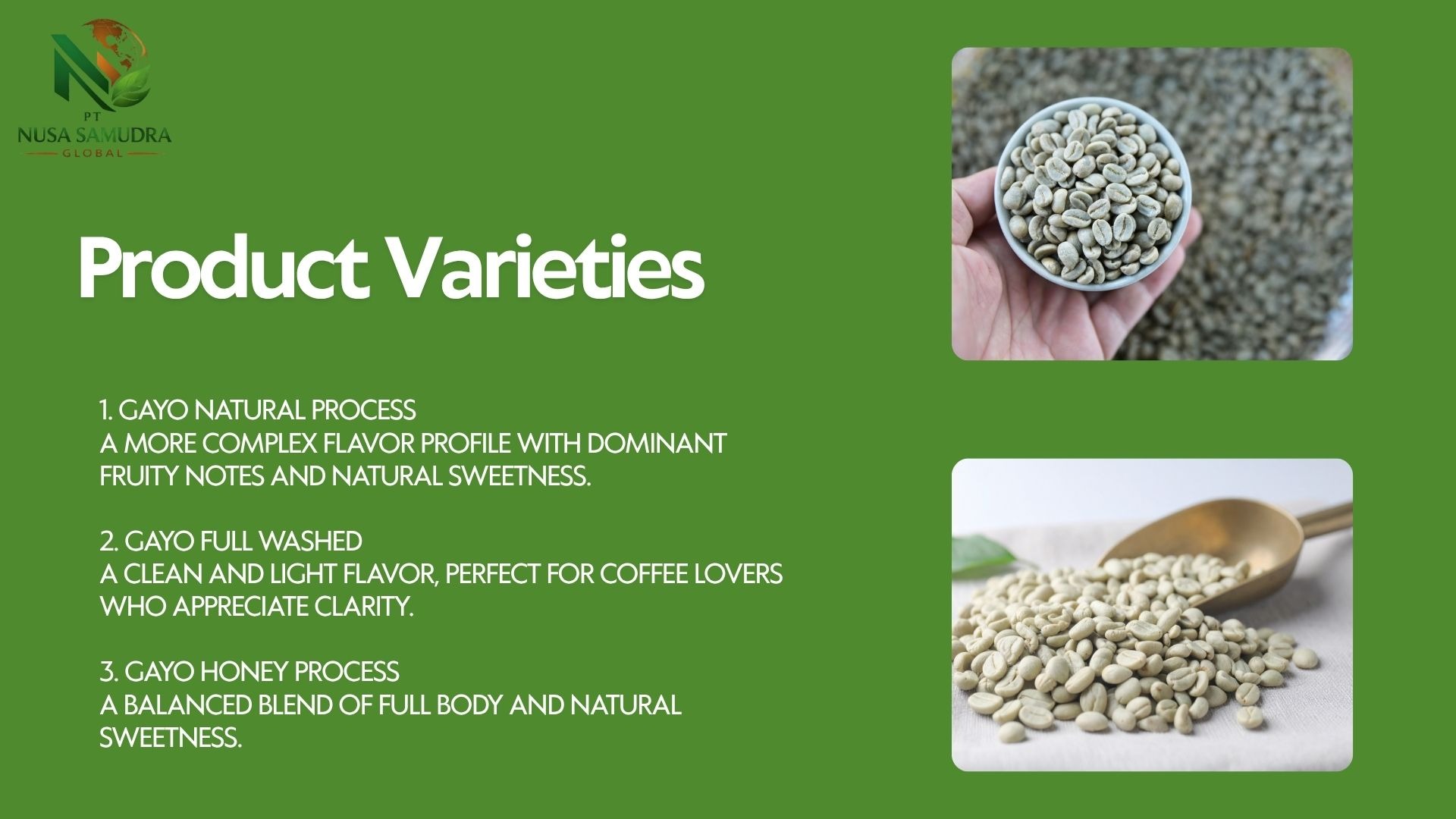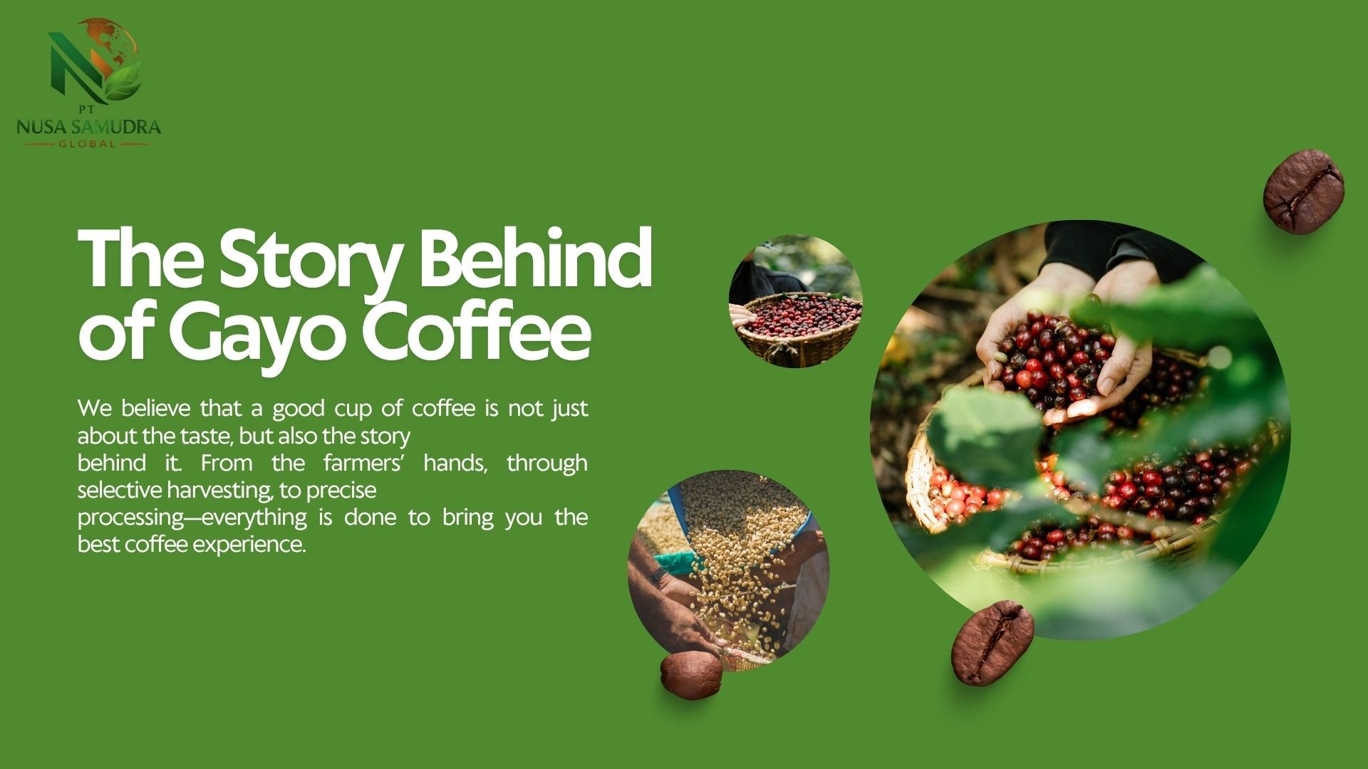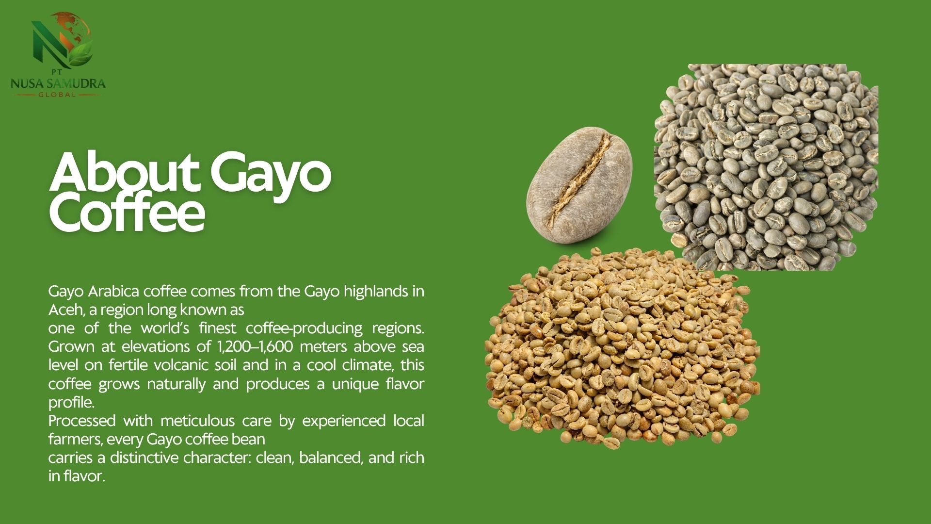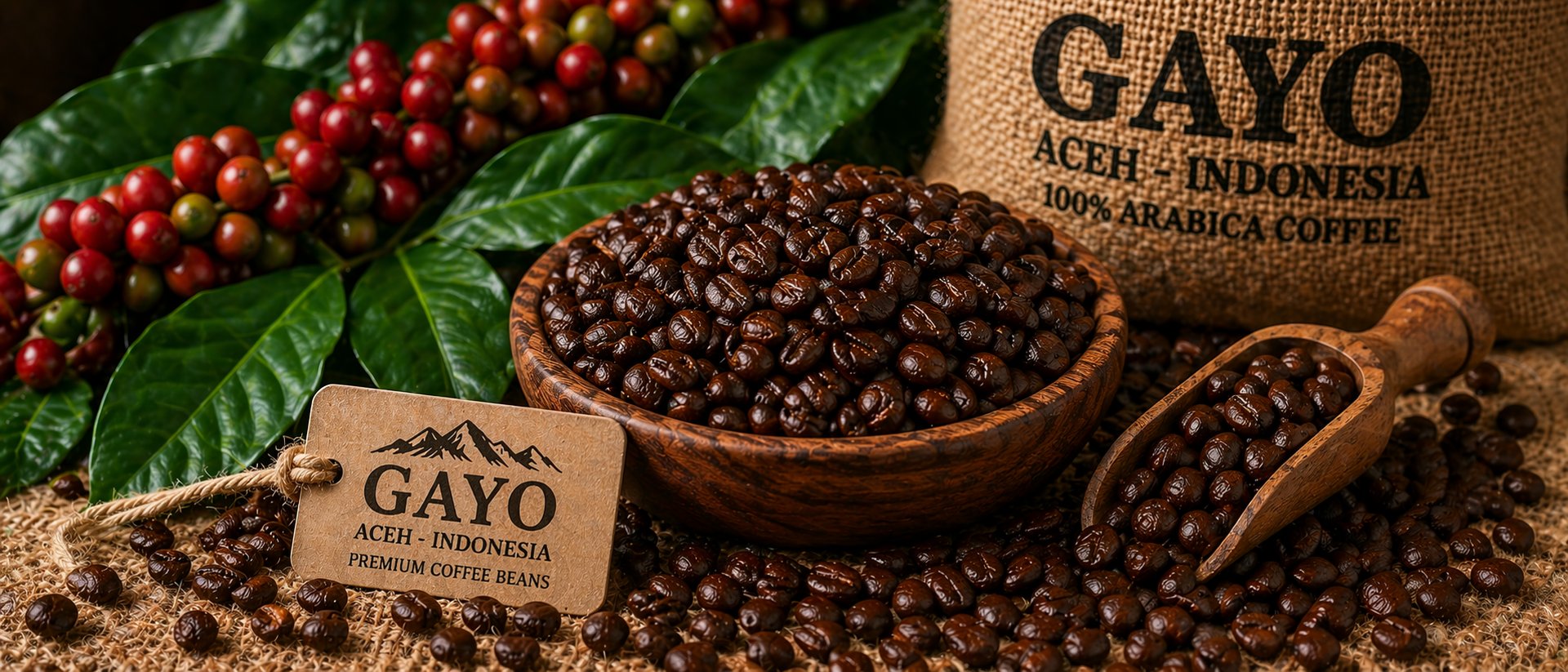 Premium Gayo Arabica coffee beans from Aceh, Indonesia, showcased in a warm and natural setting. The image highlights high-quality roasted beans with a rich texture, complemented by fresh coffee leaves and cherries, reflecting authentic origin and superior export-grade quality.