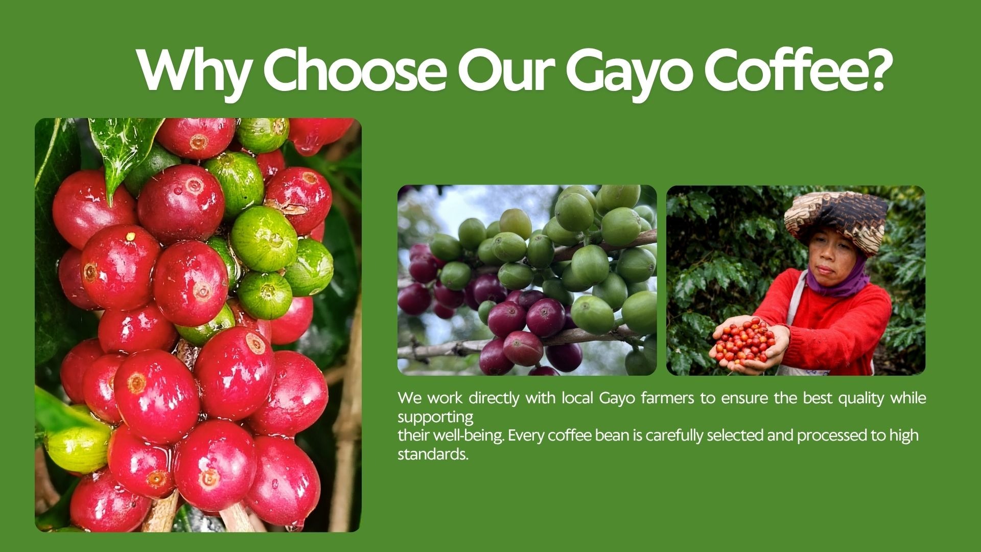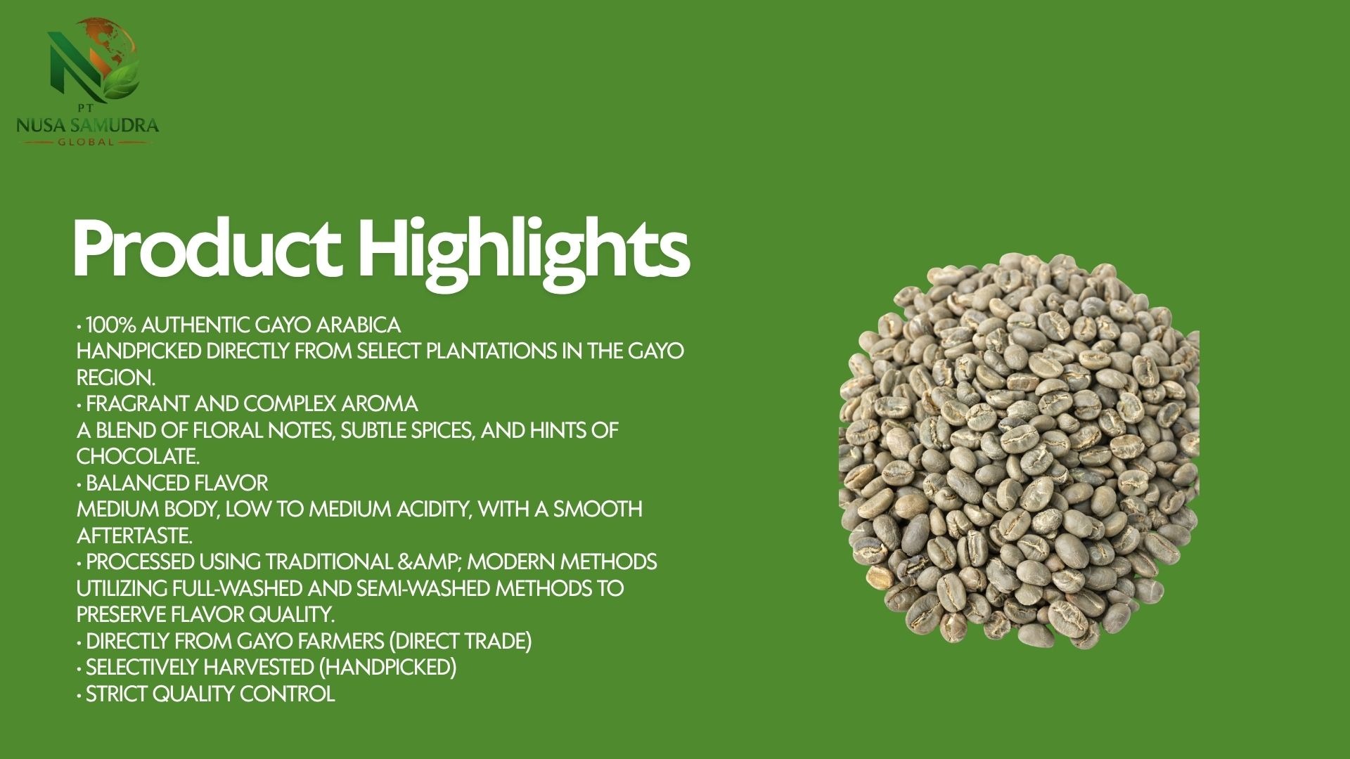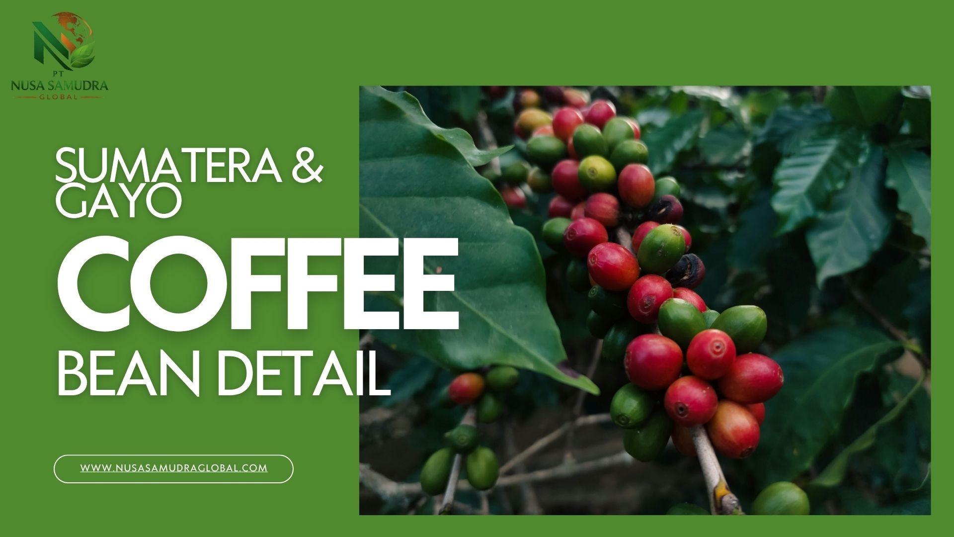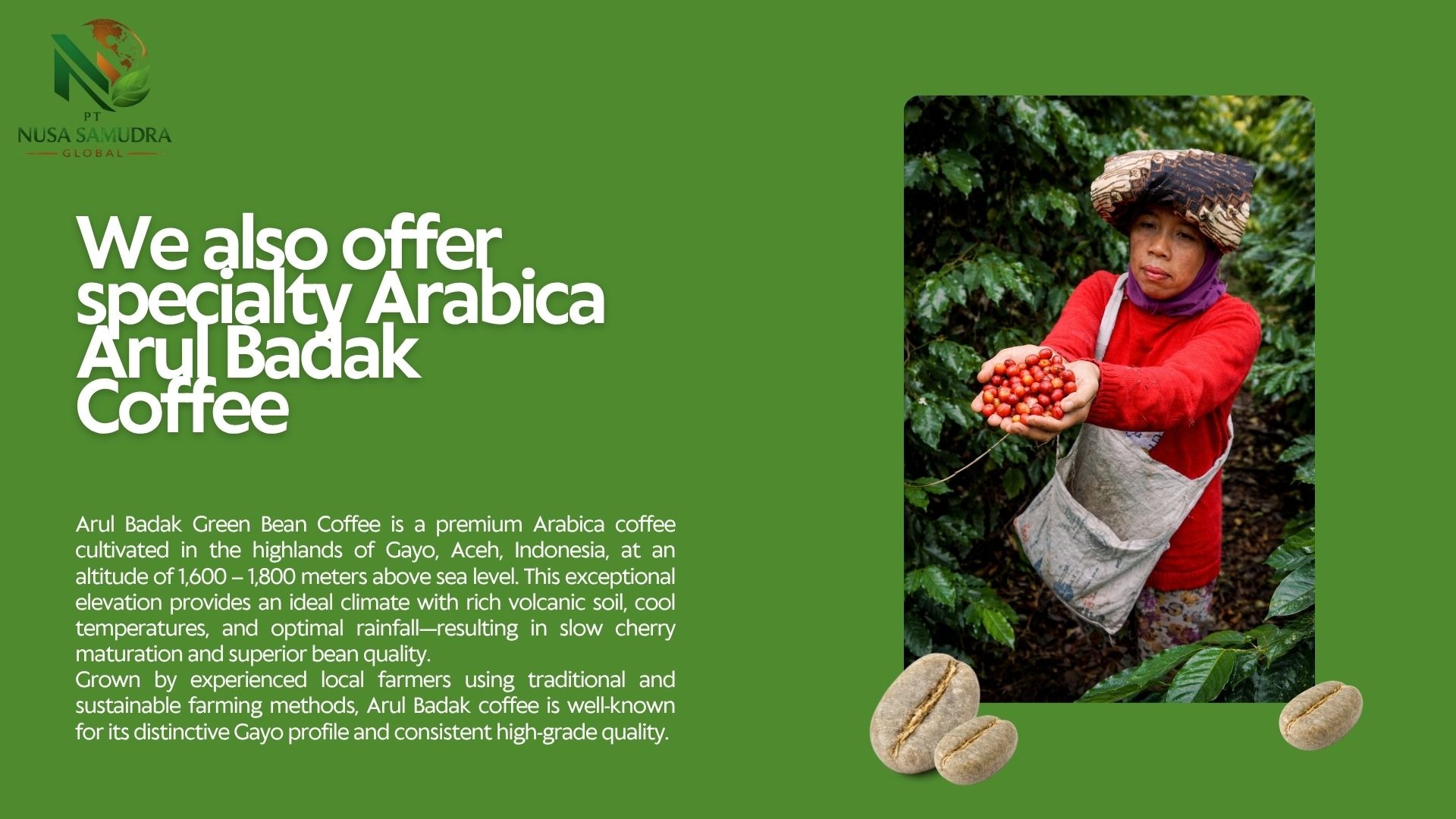 Premium Gayo Arabica coffee beans from Aceh, Indonesia, showcased in a warm and natural setting. The image highlights high-quality roasted beans with a rich texture, complemented by fresh coffee leaves and cherries, reflecting authentic origin and superior export-grade quality.