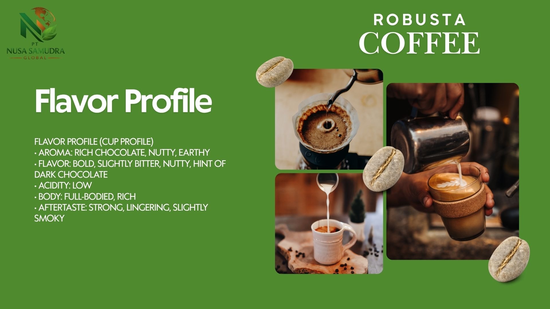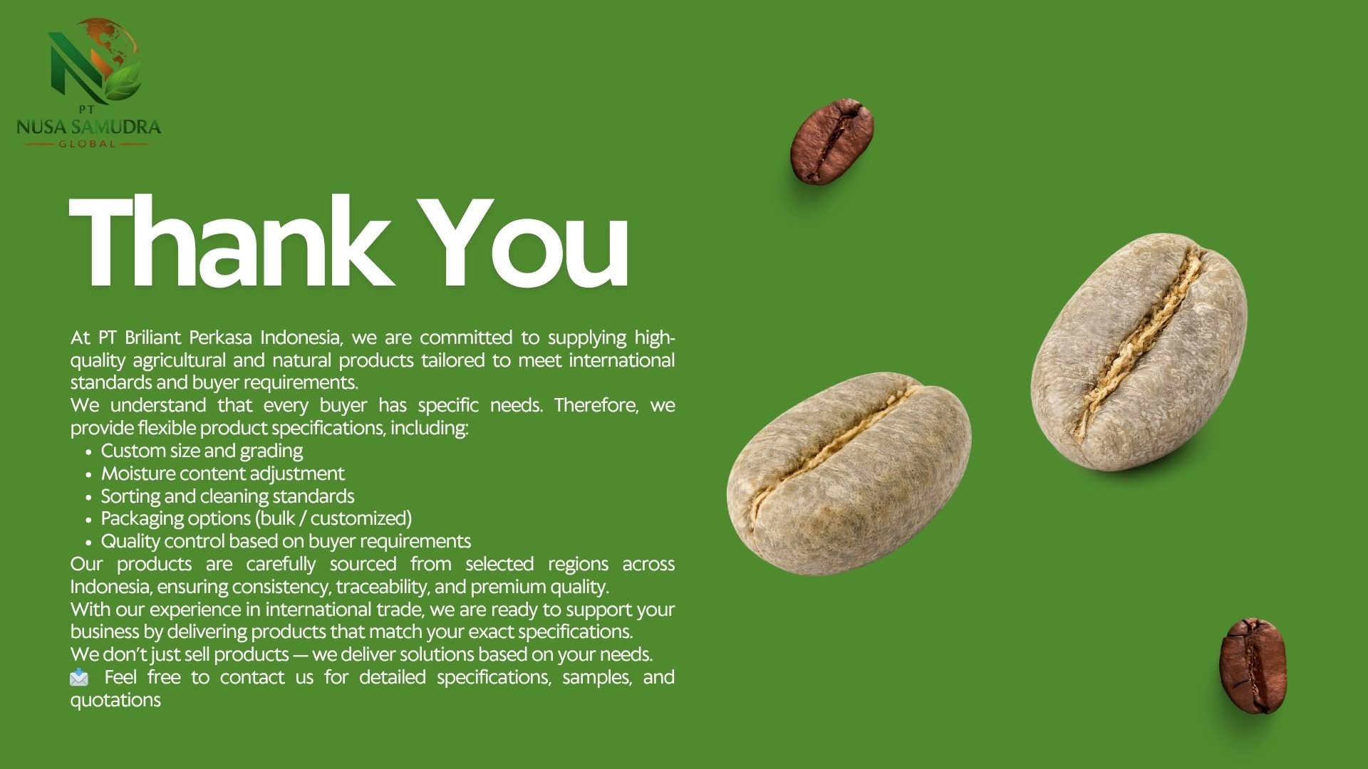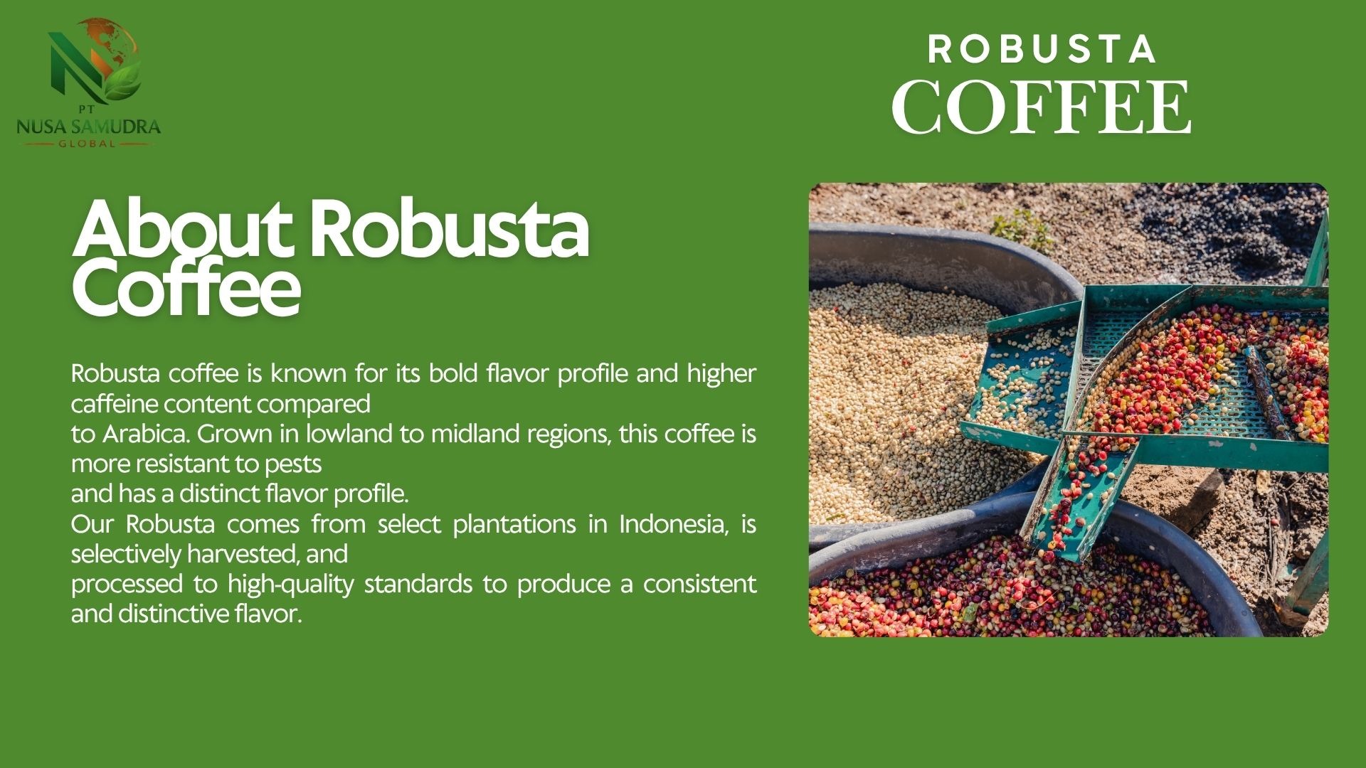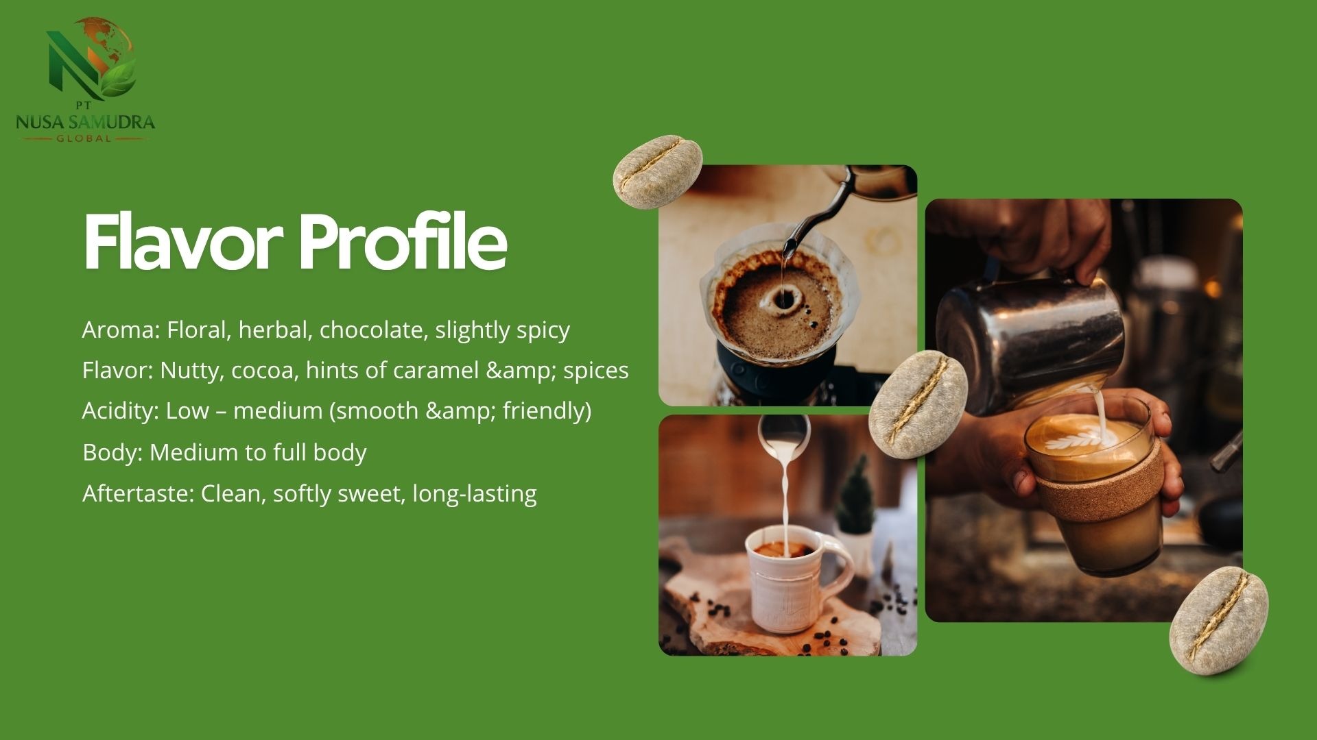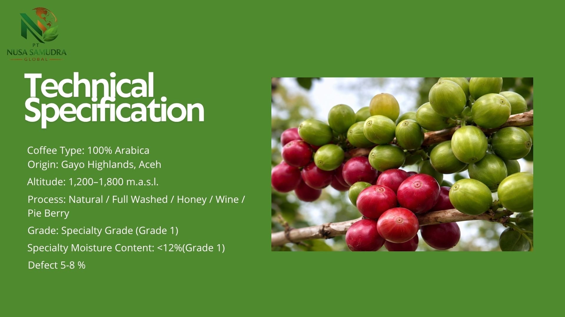Premium Gayo Arabica coffee beans from Aceh, Indonesia, showcased in a warm and natural setting. The image highlights high-quality roasted beans with a rich texture, complemented by fresh coffee leaves and cherries, reflecting authentic origin and superior export-grade quality.