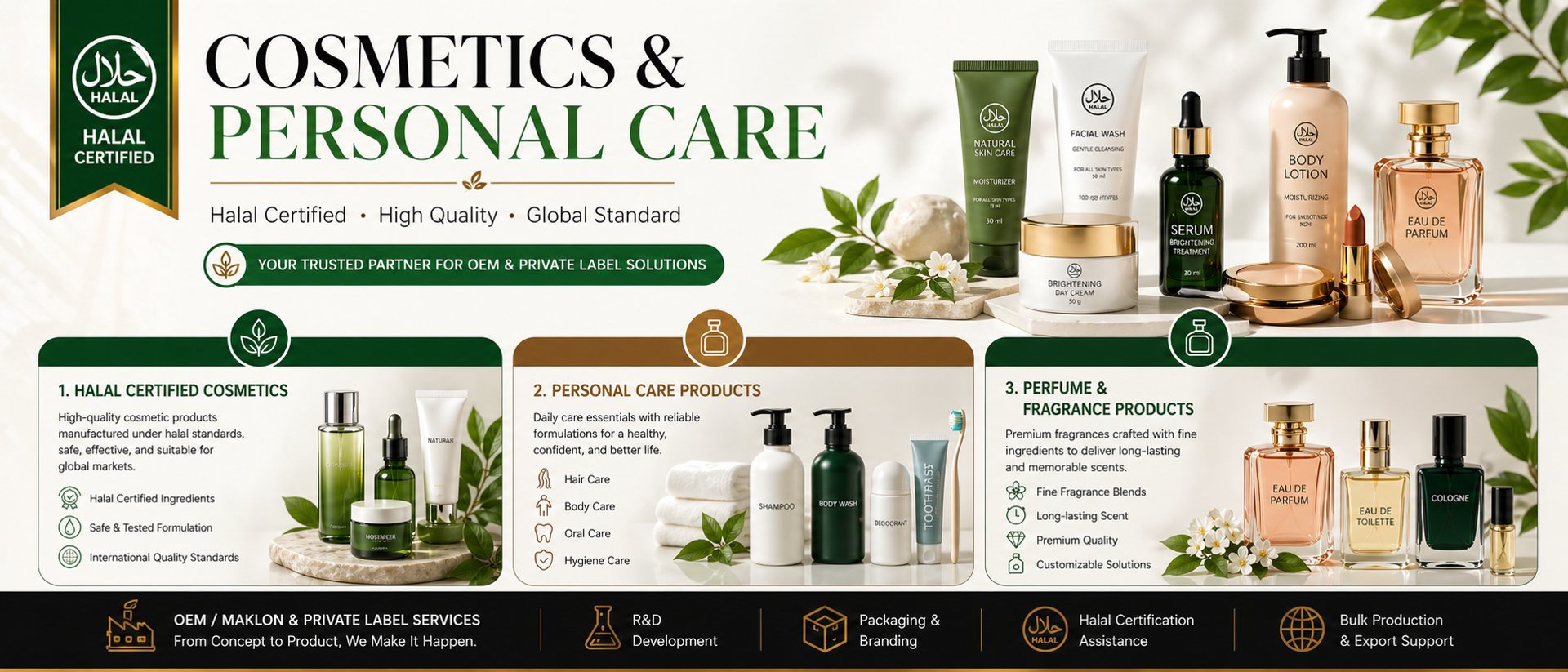 Our halal certified cosmetics are developed to meet the growing demand for safe, high-quality, and ethically produced beauty products. Each product can be formulated according to halal standards, using carefully selected ingredients that are suitable for both local and international markets. This category includes skincare, decorative cosmetics, and body care products, making it ideal for brands, distributors, and businesses looking to offer trusted halal beauty solutions.