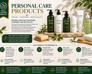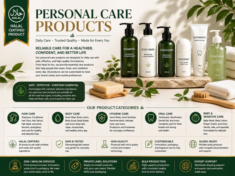 Our personal care products are designed for daily use with reliable, effective, and customizable formulations. This category covers essential products such as hair care, body wash, hygiene products, oral care, baby care, and sensitive skin products. With flexible formulation and packaging options, these products are suitable for B2B supply, private label brands, retail distribution, and export markets.