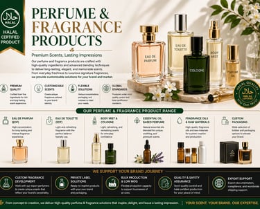 Our perfume and fragrance products are crafted to deliver long-lasting, memorable, and premium scent experiences. This category includes Eau de Parfum, Eau de Toilette, body mist, cologne, essential oil-based perfumes, fragrance oils, and raw materials. Products can be customized based on scent profile, packaging, concentration, and branding needs, making them suitable for private label, bulk supply, and international fragrance businesses.