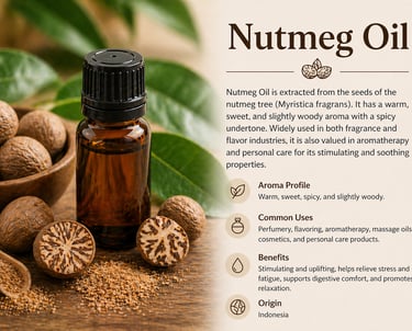 Nutmeg Oil is extracted from the seeds of the nutmeg tree and offers a warm, sweet, and slightly woody scent. It is widely used in both the flavor and fragrance industries. Known for its stimulating and calming effects, nutmeg oil is often utilized in aromatherapy, massage oils, and personal care products, as well as in fine fragrance blends.