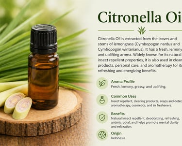 Citronella Oil is obtained from the leaves and stems of lemongrass species and is known for its fresh, lemony, and uplifting aroma. It is widely used as a natural insect repellent and in cleaning and household products. Additionally, citronella oil is popular in aromatherapy for its refreshing and energizing properties.