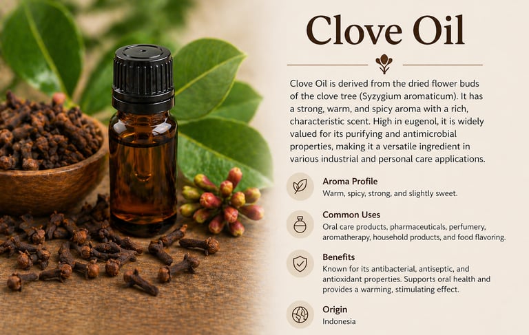 Clove Oil is derived from the dried flower buds of the clove tree and is recognized for its strong, warm, and spicy aroma. It contains high levels of eugenol, making it highly effective for antimicrobial and antiseptic purposes. This oil is commonly used in oral care products, pharmaceuticals, and as a key ingredient in spicy and oriental fragrance compositions.