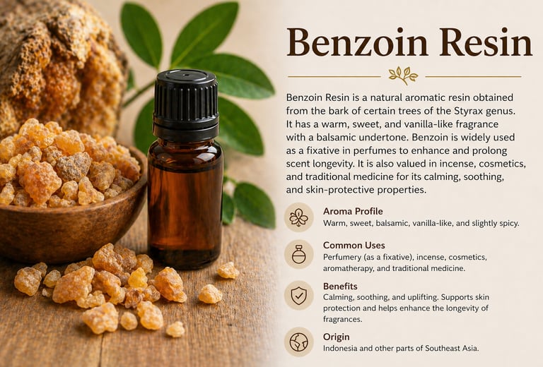Benzoin Resin is a natural aromatic resin obtained from the bark of certain trees. It has a warm, sweet, vanilla-like fragrance and is commonly used as a fixative in perfumes to enhance longevity. Benzoin is also valued in incense, cosmetics, and traditional medicine for its calming and skin-protective properties.